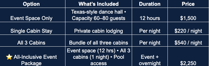 You can reserve our space for anything from a single cabin stay to a complete event experience. Cabins can be booked separately or together, with the event space available for a 12-hour rental.