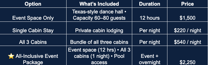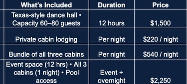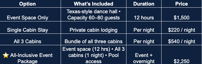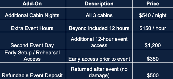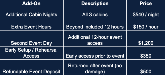 You can reserve our space for anything from a single cabin stay to a complete event experience. Cabins can be booked separately or together, with the event space available for a 12-hour rental.