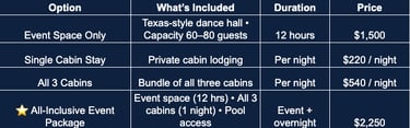 You can reserve our space for anything from a single cabin stay to a complete event experience. Cabins can be booked separately or together, with the event space available for a 12-hour rental.